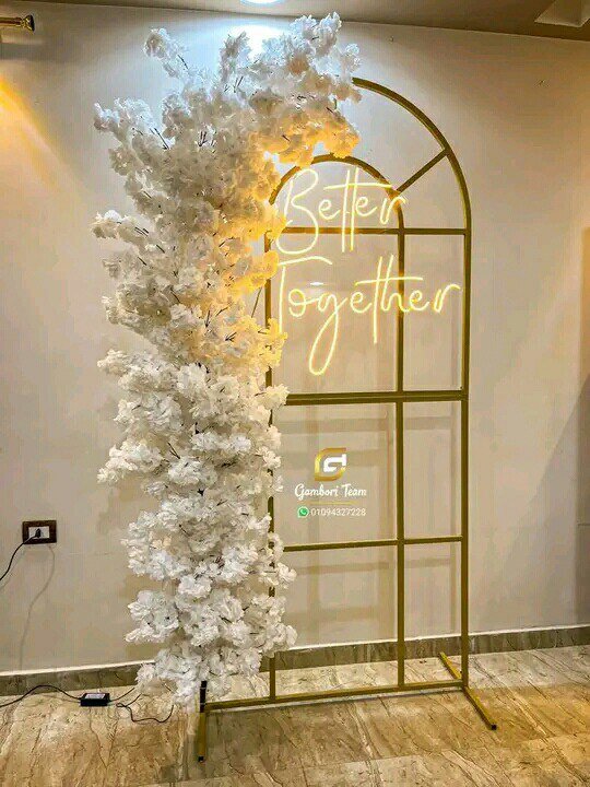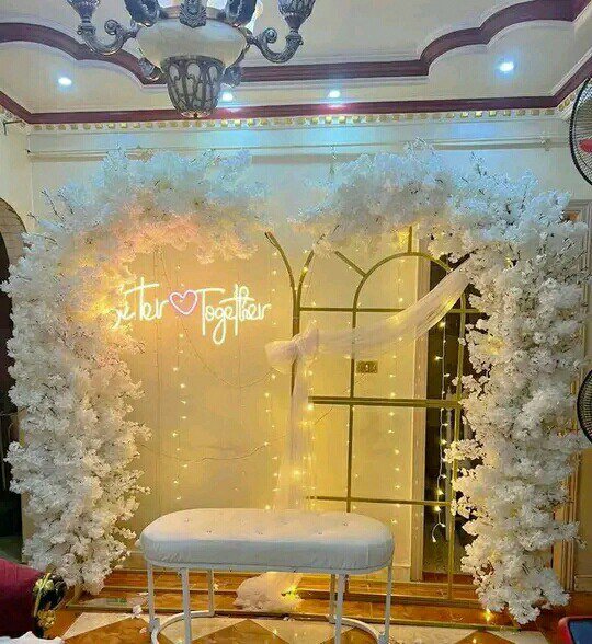 This elegant setup is designed to capture the essence of romance and unity. A stunning arch made of white artificial flowers is beautifully complemented by cascading string lights and sheer white drapery. At its center, a glowing neon sign reads “Better ♥ Together,”. A plush white bench invites couples to sit and create lasting memories, while the luxurious backdrop—featuring mirrored panels and a chandelier—adds a touch of sophistication. Ideal for weddings, engagements, or anniversary celebrations.